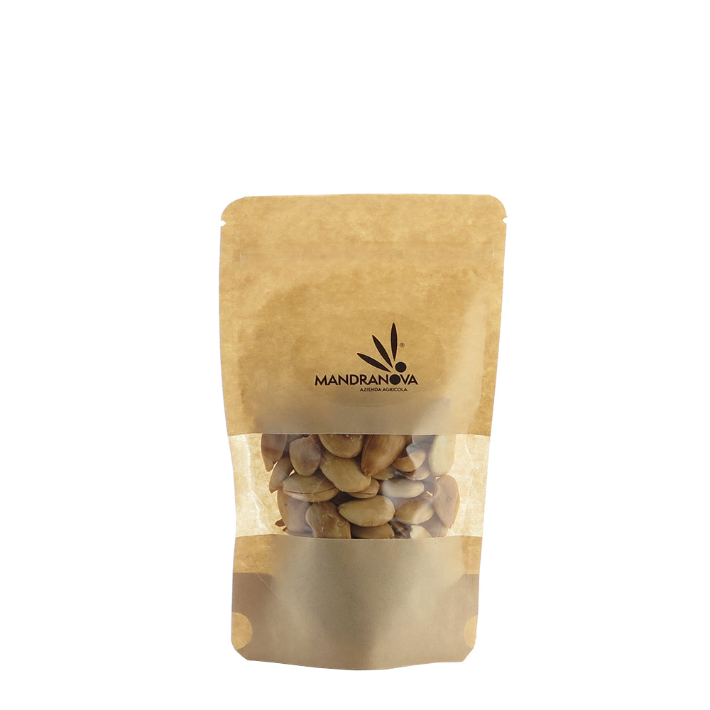 Migdale naturale prăjite, din Sicilia, provenite de la ferma Mandranova. Adăugarea unei cantități mici de albuș de ou și sare de mare contribuie la obținerea unei gustări excelente și sănătoase, ideală pentru a fi savurată alături de un aperitiv.